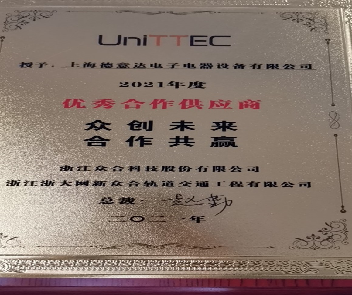 2021年度,伟德国际1946源于英国(CHINA)唯一官方网站作为浙江众合科技股份有限公司的供应商,凭借优良的产品性能、稳定的产品质量、准时的交付周期、优质的服务,获评为“优秀合作供应商”。